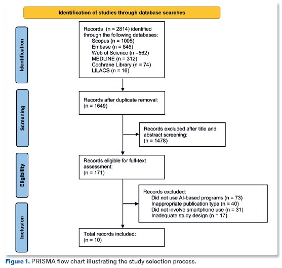 A systematic search was conducted in six databases (Scopus, Embase, Web of Science, MEDLINE, Cochrane Library, and LILACS), which initially identified 2,814 potentially relevant records. After removing 1,165 duplicate articles, 1,649 unique records remained. Of these, 1,478 were excluded during title and abstract screening. The full texts of the remaining 171 articles were assessed, and 161 were excluded because they did not meet the inclusion criteria. Ultimately, 10 studies were included in the final meta-analysis9,15-23. The study selection process is illustrated in Figure 1, following the PRISMA flowchart format.