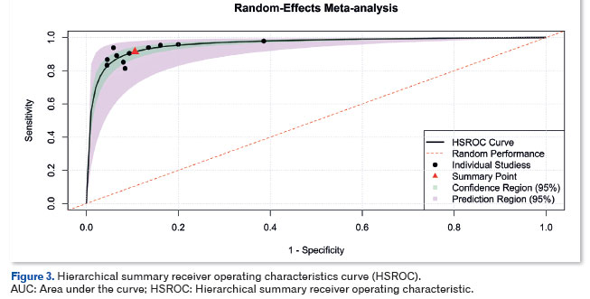 A hierarchical summary receiver operating characteristic (HSROC) curve was generated to summarize diagnostic performance, and the area under the curve (AUC) was used to assess overall model accuracy.