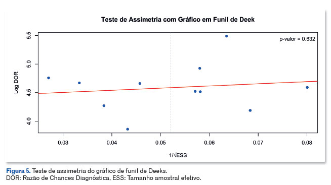 O viés de publicação foi avaliado por meio do Teste de assimetria do gráfico de funil de Deeks, específico para metanálises bivariadas de acurácia diagnóstica. Os valores de p<0,1 foram considerados indicativos de viés de publicação.