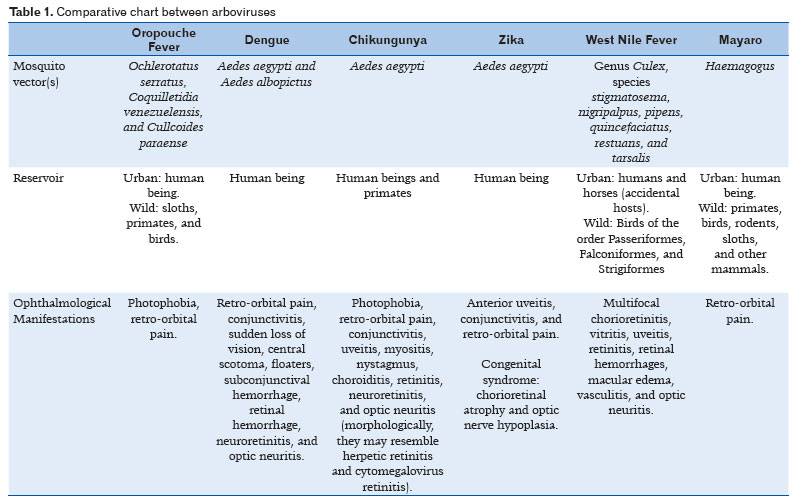 Keywords: Chikungunya; Dengue; Ophthalmological manifestations; Mayaro Fever; Oropuche fever; West Nile fever; Zika; Zoonoses.