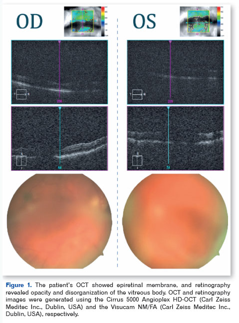 A 65-year-old patient with FAP and TTR missense variant p.Val30Met (c.148G>A; RefSeq: NM_000371.4), which results in the exchange of the p.Val50Met protein, presented with progressive visual loss in both eyes over a period of 1 year. Upon examination, the patient had best corrected visual acuity (BCVA) of 20/80 in the right eye (OD) and 20/400 in the left eye (OS), with IOP of 12 mmHg in both eyes, clear conjunctiva, transparent cornea, anterior chamber without reaction, and mild nuclear cataract. Retinal mapping showed opacity and disorganization of the vitreous (OD +2/4, OS +4/4). Complementary tests were also performed, and spectral-domain optical coherence tomography (SD-OCT) showed an epiretinal membrane (ERM) in the OD (Figure 1). The OS, however, could not be assessed by SD-OCT due to media opacity. Similarly, ultrasound of the eye showed an attached retina with dense vitreous material and posterior vitreous detachment.