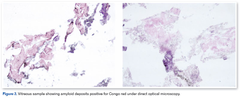 Congo red dye under polarized light is the main histological method used to identify amyloid deposits44. However, because of the high concentration of deposits in this patient, direct light was sufficient to identify the material. Although it does not accurately determine the amyloid nature of protein aggregates, it remains the fastest and most practical method for staining amyloids in vitro44,45. In this case, the patient had a late onset of the disease, which required the exclusion of other etiologies for the vitreous opacities. In addition to surgical treatment guaranteeing a functional prognosis, histology was essential to confirm the diagnostic hypothesis and exclude other causes of vitreous opacity.