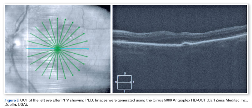 After surgery, this patient's cataract evolved rapidly, which is also to be expected after PPV given that cataract formation is the most common complication of PPV. The incidence of cataract surgery after PPV is estimated at approximately 40% and can increase to up to 85% in 5 years36,37. Considering this, the combined technique of PPV with phacoemulsification in a single procedure has been increasingly used with safety38.