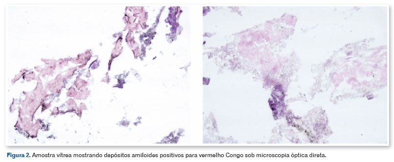 O vermelho Congo sob luz polarizada é o principal método histológico utilizado para a identificação de depósitos amiloides44. Entretanto, devido a grande concentração de depósitos neste paciente, a luz direta foi suficiente para identificação do material. Embora não determine com precisão a natureza amiloide dos agregados proteicos, continua a ser o método mais rápido e prático para a coloração de amiloides in vitro44,45. Neste caso, o paciente apresentou um início tardio da doença, exigindo a exclusão de etiologias alternativas para as opacidades vítreas. O tratamento cirúrgico não só garantiu o prognóstico funcional, como a histologia foi essencial para confirmar a hipótese diagnóstica e excluir outras causas de opacidade vítrea.