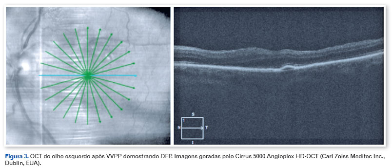 O paciente foi submetido à vitrectomia via pars plana (VVPP) com C3F8 13%, remoção da MER e peeling da membrana limitante interna (MLI) com corante membrane blue no olho esquerdo e o material vítreo foi enviado para biópsia. Não houve complicações intraoperatórias. A análise histológica do vítreo revelou a presença de depósitos amiloides através da coloração vermelho Congo observada sob luz direta (Figura 2). Três meses após a cirurgia, o paciente apresentava-se com AVCC OE 20/40, a nova OCT-SD mostrou preservação da anatomia das camadas da retina e descolamento do EPR (DEP) sem significância clínica (Figura 3). O paciente foi então encaminhado para facoemulsificação com implante de lente intraocular em OE, apresentando uma AVCC final de 20/20. O descolamento do EPR está sendo monitorizado periodicamente e não apresentou alteração/aumento após seis meses.