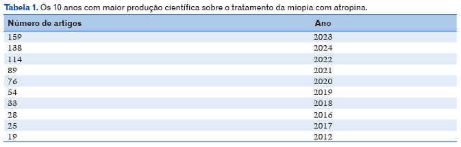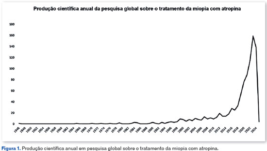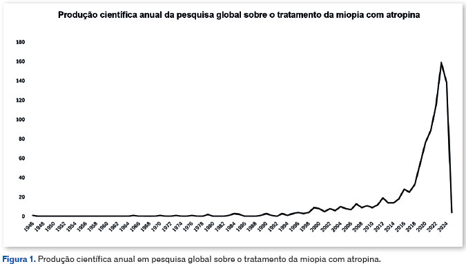 Este é o primeiro estudo a avaliar as características bibliométricas da produção científica global sobre o tratamento da miopia com atropina na base de dados WoS até 9 de janeiro de 2025. A análise revelou os seguintes resultados: um total de 936 artigos publicados sobre o uso de atropina para miopia, sendo a China o principal contribuinte, representando 34,7% (n=325) dessas publicações, refletindo o recente aumento na produção científica desde 2017; o autor mais citado foi Morgan IG "The epidemics of myopia: A etiology and prevention"3 foi o artigo mais citado, com 708 citações; os três periódicos com o maior número de publicações foram Investigative Ophthalmology & Visual Science, Ophthalmology and Optometry e Vision Science, todos dos EUA, e os autores com mais publicações foram Schaeffel F e Yam JC, cada um contribuindo com 22 trabalhos.