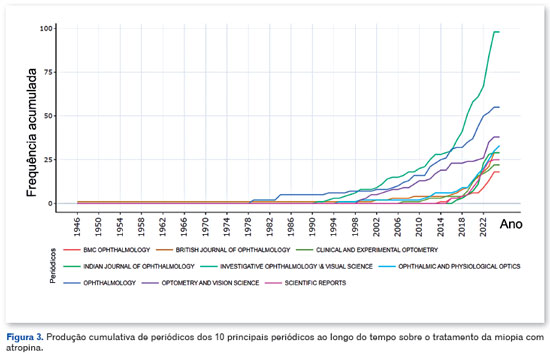 Entre os 10 principais periódicos, o Journal Investigative Ophthalmology & Visual Science publicou o maior número de artigos (98), seguido de Ophthalmology com 55 artigos; o Optometry and Vision Science contribuiu com 38 artigos, enquanto o Ophthalmic and Physiological Optics publicou 33; o British Journal of Ophthalmology e o Indian Journal of Ophthalmology apresentaram ambos 29 artigos cada; o Scientific Reports publicou 25 artigos e o Clinical and Experimental Optometry publicou 22; o BMC Ophthalmology veio em seguida com 18 artigos e o JAMA Ophthalmology contribuiu com 17 artigos para a área. A figura 3 ilustra a produção cumulativa dos 10 principais periódicos sobre o tratamento da miopia com atropina ao longo do tempo.