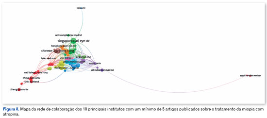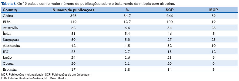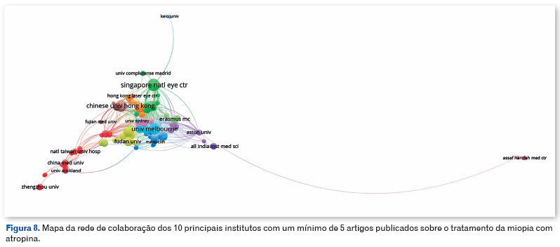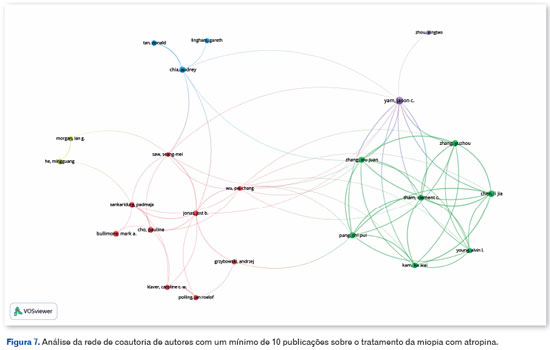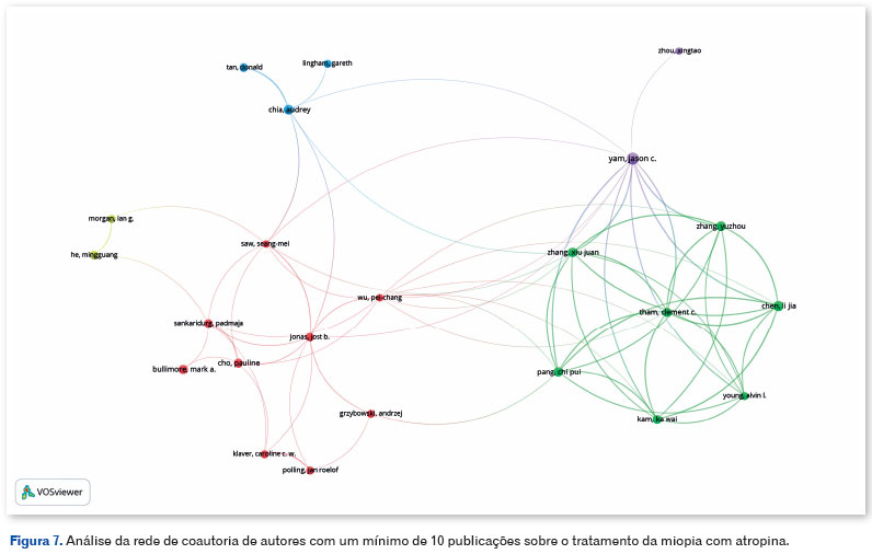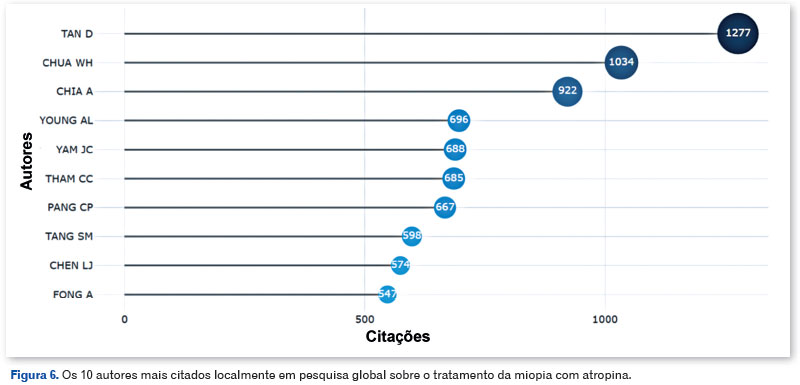 Os EUA, Singapura e Austrália têm médias de 32, 61,2 e 44,6 citações por artigo, respectivamente, em comparação com a média da China de 26,3 citações por artigo. Schaeffel F, um pesquisador alemão, e Yam JC, um pesquisador chinês, com 22 publicações cada sobre o assunto, contribuíram significativamente para estudos sobre o uso de atropina para miopia. Os autores com o maior número de publicações que os seguem também são predominantemente chineses. Nesse contexto, apesar do domínio da China e dos EUA na produção científica, há uma tendência notável de interesse no desenvolvimento de tratamentos e profilaxia para miopia que se estende a outras áreas globais, como evidenciado pelo fato de que metade dos países classificados entre os 10 principais editores sobre o assunto estão fora dos continentes asiático e norte-americano.