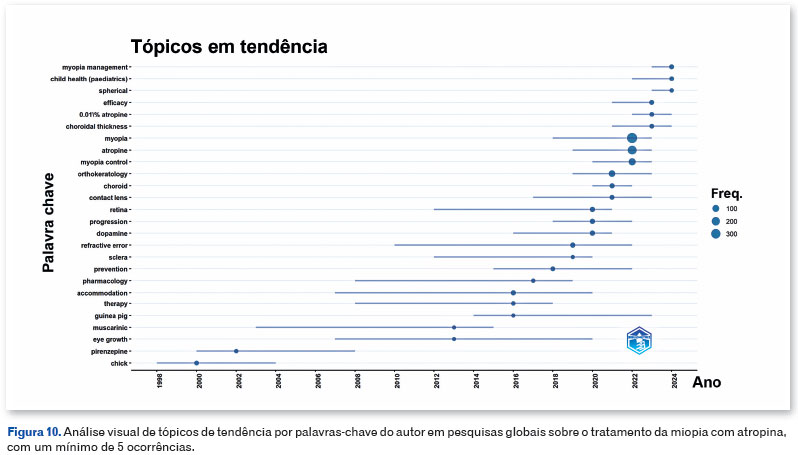Em relação à ocorrência de palavras-chave e tópicos de tendência, termos como "atropina", "prevalência", "crianças", "progressão" e "eficácia" se destacaram como os mais frequentes. Esse padrão reflete o foco predominante da pesquisa atual, destacando uma prioridade científica para melhor compreender os efeitos da atropina no tratamento de condições oftalmológicas, como a miopia. A presença recorrente da palavra "crianças" sugere um interesse particular no impacto da atropina na população pediátrica, que é considerada especialmente vulnerável à progressão da miopia. Alguns estudos sugeriram resultados favoráveis na redução da progressão da miopia após o uso de atropina, enfatizando ainda mais seu potencial como uma intervenção eficaz nessa faixa etária30,31. Além disso, o uso de termos como "prevalência" e "progressão" surge como um tópico relevante de tendência, demonstrando uma preocupação em avaliar a magnitude do problema e a eficácia da intervenção ao longo do tempo.