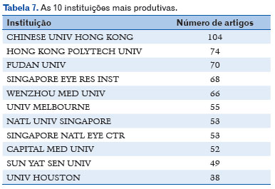 Um total de 1086 instituições estiveram envolvidas. Como mostra a Tabela 7, a área é fortemente dominada por instituições asiáticas. A Universidade Chinesa de Hong Kong lidera com 104 publicações, seguida pela Universidade Politécnica de Hong Kong (74), Universidade Fudan (70), Instituto de Pesquisa Oftalmológica de Singapura (68) e Universidade Médica de Wenzhou (66).