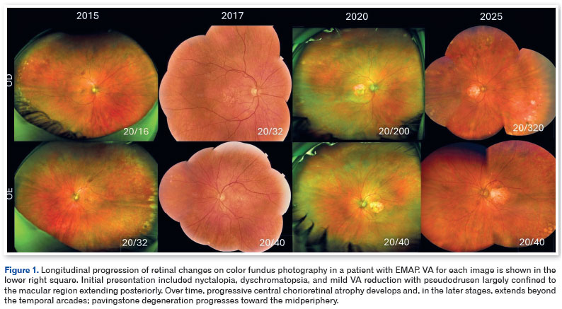 Extensive macular atrophy with pseudodrusen (EMAP) is a clinical entity marked by a triad encompassing macular atrophy with predominance along the vertical axis, the presence of pseudodrusen, and peripheral pavingstone-like degeneration, typically bilateral and symmetric1. This progressive condition is associated with cumulative structural and functional retinal impairment over time.