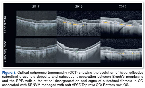 Subsequent studies have demonstrated that this disease may be complicated by the occurrence of subretinal macular neovascularization, an event that potentially contributes to visual deterioration and modifies its clinical presentation2. Since its initial description as a distinct entity3, longitudinal investigations have characterized its progression pattern and functional impact over time4,5.