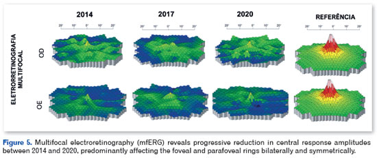 In conclusion, the presence of a previous history of rheumatic fever and/or the early and progressive onset of retinal degeneration should raise diagnostic suspicion for EMAP. Multimodal follow-up allowed objective documentation of early structural and functional changes in the retina and macula, demonstrating the progression of retinal involvement to chorioretinal atrophy. The pattern of widespread rod and cone dysfunction observed on full-field ERG, alongside macular cone impairment on mfERG, reinforces the understanding of EMAP as a diffuse retinal disease. These findings highlight the essential role of multimodal evaluation—integrating high-resolution imaging and electrophysiological testing—in the diagnosis, longitudinal monitoring, and appropriate clinical management of patients with EMAP.