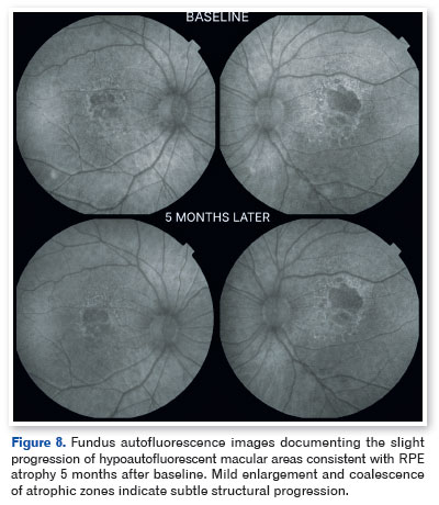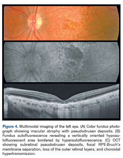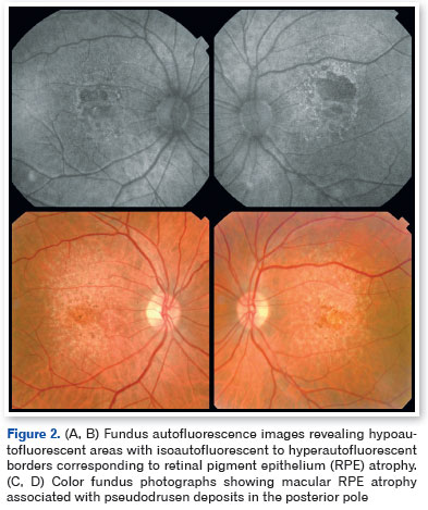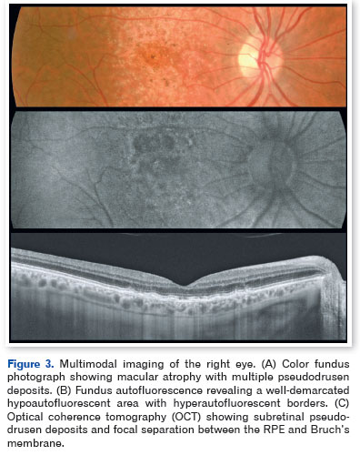 Optical coherence tomography demonstrated pseudodrusen deposits at the posterior pole, focal separation between the RPE and Bruch's membrane, and areas of macular atrophy. Fundus autofluorescence revealed sharply demarcated hypoautofluorescent zones with isoautofluorescent to hyperautofluorescent borders, consistent with RPE loss (Figures 3-5).