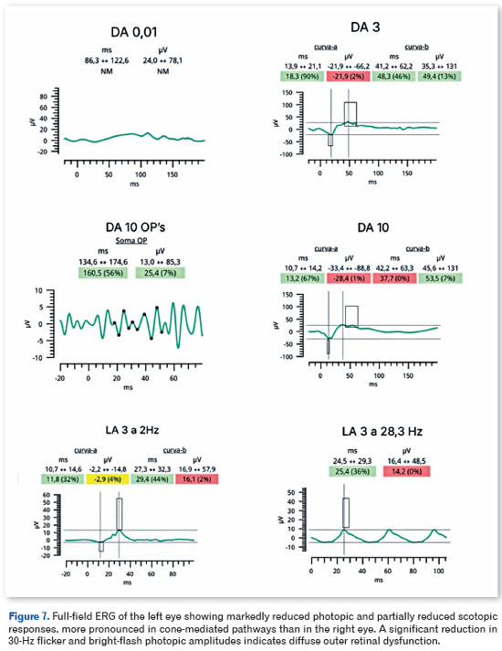 Full-field electroretinography, performed in accordance with International Society for Clinical Electrophysiology of Vision (ISCEV) standards, demonstrated bilateral, predominantly cone-mediated retinal dysfunction, characterized by reduced photopic and 30-Hz flicker amplitudes with partial preservation of mixed rod responses, more pronounced in the left eye (Figures 6 and 7).