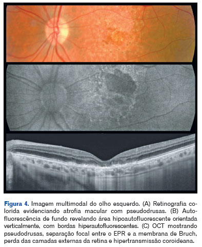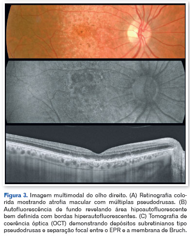 A tomografia de coerência óptica (OCT) mostrou pseudodrusas no polo posterior, separação focal entre o epitélio pigmentar da retina e a membrana de Bruch, além de áreas de atrofia macular. A autofluorescência evidenciou zonas hipoautofluorescentes bem delimitadas com bordas iso- a hiperautofluorescentes, compatíveis com perda do epitélio pigmentar da retina (Figuras 3, 4 e 5).