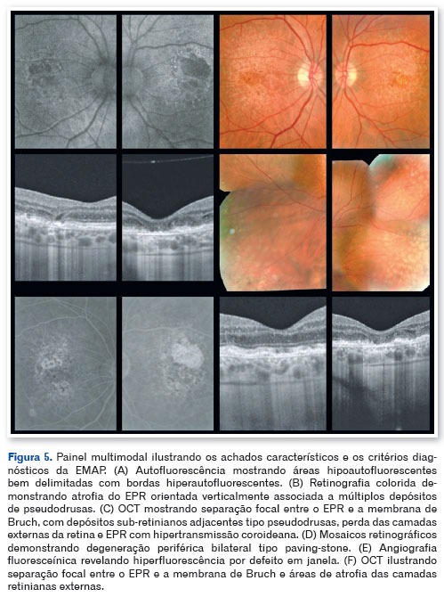 Embora o fenótipo da EMAP seja distinto, é fundamental diferenciá-la da atrofia geográfica difusa da degeneração macular relacionada à idade (DMRI), particularmente da forma diffuse trickling, conhecida por sua evolução mais agressiva5. Para distinguir a EMAP de outras formas de atrofia macular, Antropoli et al.3 propuseram critérios diagnósticos que incluem atrofia bilateral e simétrica com bordas multilobuladas e orientação vertical; presença de pseudodrusas difusas; degeneração periférica tipo paving-stone; e achados característicos em exames multimodais. Na autofluorescência, destacam-se áreas hipoautofluorescentes bem definidas com bordas iso- a hiperautofluorescentes, e na tomografia de coerência óptica (OCT), a perda das camadas externas da retina, alterações do complexo epitélio pigmentar da retina (EPR)-membrana de Bruch e afinamento coroidal3,4,6. Alterações eletrofisiológicas com disfunção predominantemente cone-mediada complementam o diagnóstico funcional7,8.