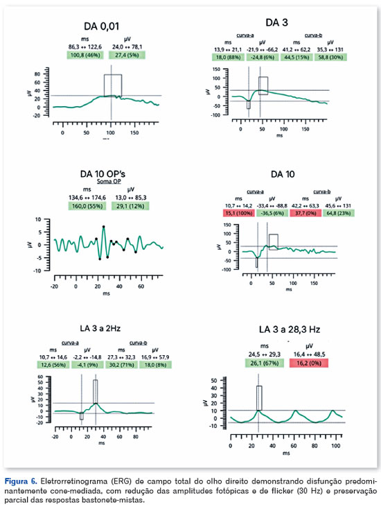 O eletrorretinograma de campo total demonstrou disfunção retiniana bilateral predominantemente cone-mediada, com redução difusa das amplitudes fotópicas e de flicker e preservação parcial das respostas bastonete-mistas, corroborando disfunção difusa da retina externa e o caráter neurodegenerativo da EMAP7,8.