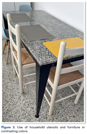 The strategic use of color contrast between surfaces, objects, and backgrounds facilitates visual perception and helps avoid mistakes during daily activities. Examples include the use of utensils and furniture in contrasting colors and the visual separation of functional boundaries (Figure 3).