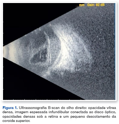 A ultrassonografia modo B evidenciou opacidade vítrea densa, imagem espessada em forma de funil conectada ao disco óptico, opacidades sub-retinianas e pequeno descolamento coroidal superior (Figura 1). Foi realizada paracentese de humor aquoso, com reação em cadeia da polimerase (PCR) negativa para Toxoplasma gondii, Cytomegalovirus, Herpes simplex tipo 1 e Varicella zoster. Diante da hipótese de pan-uveíte de etiologia indeterminada, indicou-se vitrectomia diagnóstica.