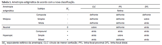 Substituindo os limites do intervalo de Sturm pelo círculo de menor confusão (CLC) como o ponto de referência para a classificação da AA, produzimos uma classificação muito simples, perfeitamente integrada ao SEa. Nessa linha de raciocínio, a AA é classificada como miópica, hipermetrópica e neutra quando o CLC estiver posicionado na frente (SE a < 0), atrás (SE a > 0) e sobre a retina (SE a = 0), respectivamente.