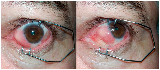A 52-year-old male patient was admitted to the clinic of the Fundação de Banco de Olhos de Goiás (FUBOG) with pain in the left eye (LE) that had progressed after pterygium exertion surgery with mitomycin C (MMC) application. A 2-month postoperative follow-up was conducted at another hospital.