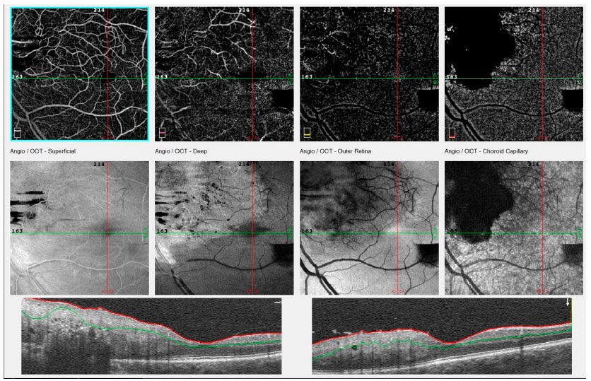 The SD-OCT revealed a well-defined retinal lesion with optically empty spaces (OESs) and the presence of hyperreflective dots (Figure 4).