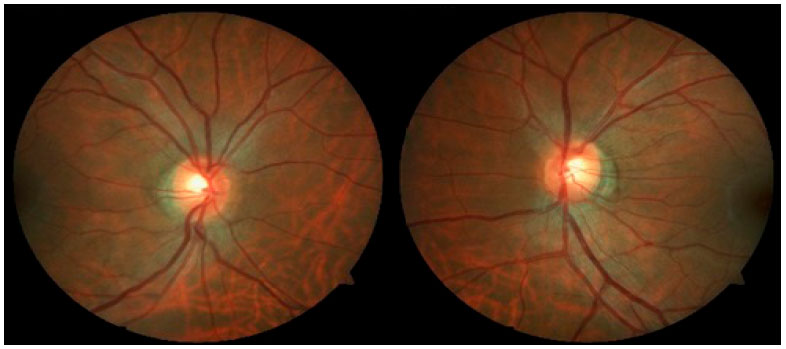 Case1: A 36-year-old white emmetropic man complaining of irritation and pain and seeing colored halos around lights in the left eye (LE) for 3 years. History: lumbago. On examination: Uncorrected visual acuity (VA) of 20/20 in both eyes (BE); Biomicroscopy (Bio): normal right eye (RE) and fine keratic precipitates, traces of cells, and initial cataracts in the LE; IOP of 16 and 40 mmHg (10:30 h) measured by Goldmann applanation tonometry; Ophthalmoscopy: pale-pink, well-delimited medial nerve, 360° rim and physiological excavation in BE (Figure 1). Prescription: prednisolone acetate 1% combined with Timolol maleate 0.5% and Brinzolamide and tests were requested. After 3 days, IOP: 12 mmHg in BE (10:30 h) measured by Goldmann applanation tonometry, and negative tests for infectious and rheumatological diseases.