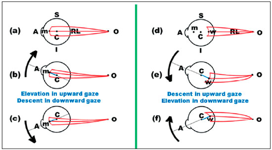 An identical procedure can be performed with regard to vertical deviations, wherein the action of the vertical recti predominates. In a R/L deviation, the test conditions would be those of RIR (deviation in downward gaze with the right-eye fixing) and those of LSR (deviation in upward gaze with the left eye fixing). In a L/R deviation, the test conditions would be those of LIR (deviation in downward gaze with the left eye fixing) and those of RSR (deviation in upward gaze with the right-eye fixing).