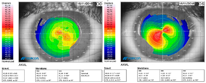Figure 1. Topographic map showing keratoconus, more pronounced in the left eye.