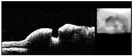 Figura 7. Tomografia de coerência óptica (OCT). Corte óptico na área do macroaneurisma, evidenciado por lesão arredondada no centro do corte óptico e com imagem de atenuação posterior.