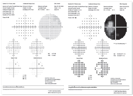After 2 months, she returned with complaint of sudden low visual acuity (LVA) in the left eye (OS) that persisted for 6 hours. She reported normal vision on the previous day; however, when she woke up, she noticed LVA in OS, with a small region of inferior temporal vision. Ophthalmological examination: BCVA: 20/25 and hand movement, IOP: 14 and 16mmHg. Confrontation field: impaired in OS. Eye reflexes: preserved in OD, OS: decreased consensual reflex 2+, decreased direct reflex 1+, with a relative afferent pupillary defect. Pupils: anisocoric, moderate mydriasis in OS. Retinal mapping: OD: no changes. OS: physiological excavation, rosy papilla, and retinal pallor in the perimacular region.