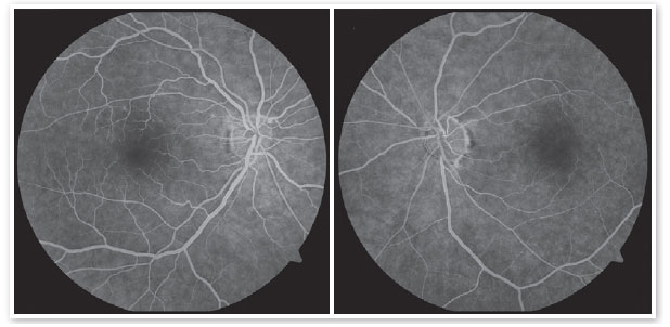On ophthalmological examination, she had best corrected visual acuity (BCVA) of 20/25 OU; IOP measured by the applanation method was 14 and 12mmHg. Biomicroscopy showed no changes in OU. Eye reflexes showed preserved OU. Retinal mapping indicated physiological excavation, well delimited and rosy papillae, free macula, preserved vascular arches, retina applied to the posterior pole (Figure 1).