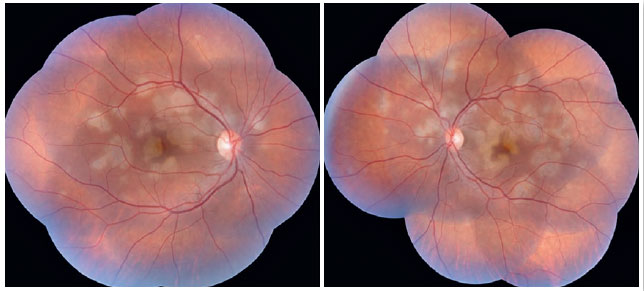 Figura 1. Retinografia em AO com múltiplas lesões brancas, de consistência cremosa e em formato de placas confluentes no polo posterior, com extensão à média. periferia nasal, bilateralmente. Observa-se, também, atrofia e hiperpigmentação na mácula.