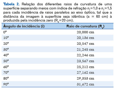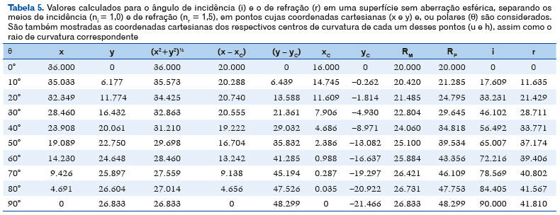 A tabela 4 resume valores das variáveis de curvas sem aberração esférica, conforme o índice de refração nr, para o caso de o de incidência (ni) ser o ar (ni = 1,0).Os cálculos do exemplo acima considerado (q = 60 cm e Figura 12) correspondem aos da terceira linha da tabela 4 (nr = 1,500).
