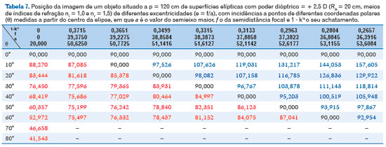 A tabela 10 mostra os valores do raio de curvatura (RP) para pontos dessa elipse, com diferentes coordenadas angulares relativamente ao centro dela (θ), assim como os de outras variáveis correspondentes. A figura 19 expõe, pictoricamente, a variação desses raios de curvatura e dos correspondentes valores dióptricos (considerou-se a curva como separando meios com índices de refração ni = 1,0 e nr = 1,5).