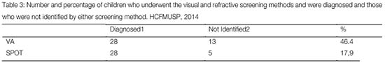 In this study, using visual screening with the Snellen chart as part of a complete ophthalmologic exam, we found that 43 children (44.3%) exhibited uncorrected monocular VA≤ 0.7 and/or a difference in VA of two or more lines between the two eyes, whereas543 (55.7%) exhibited uncorrected monocular VA > 0.7 (Table 1). Using refractive screening with the SpotTM Vision Screener as part of a complete ophthalmologic exam, we found that 33 children (34.1%) exhibited hypermetropia ≥ +3.00 D, myopia ≥ −0.75 D, and/or astigmatism ≥ −0.75 D, whereas 64 (65.9%) exhibited hypermetropia<+3.00 D, myopia < −0.75. D, and/or astigmatism<−0.75 D (Table 2). Of the 28 children diagnosed with refractive errors above the cut-off point, 13 (46.4%) failed to be identified by visual screening and five (17.9%) failed to be identified by refractive screening (Table 3). Differences in the values obtained after using the two types of screening methods (visual and refractive) are directly correlated with the manner in which the information was obtained. Visual screening depends on subjective information and is subject to the children's verbal skills, neural and psychomotor development, understanding of the exam, reading skills and speed, and other factors, all of which influence the information obtained when measuring VA. Measurements obtained in the refractive screening method do not depend on the children’s understanding of the method or on subjective information obtained during the exam. This exam is performed with no physical contact with the child; however, it may be influenced by the changes in the transparency of ocular structures or by theenvironment, such as excessive lighting, which may alter the pupil size and hamper photorefraction10.