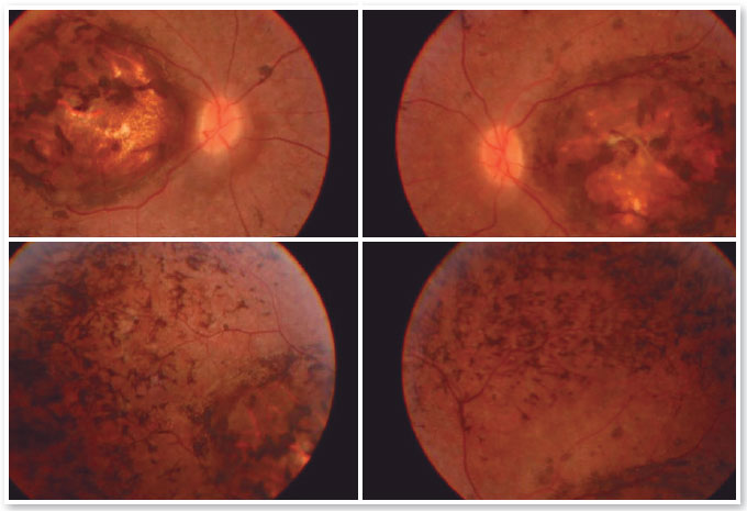 Figura 1. Retinografia de ambos os olhos mostrando coloboma macular com áreas de hiperplasia de epitélio pigmentar da retina na área do coloboma e média periferia.