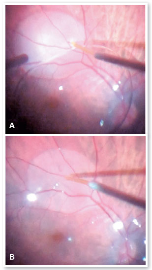 Figura 2. (A) Usando uma cânula de calibre 38 e aspiração ativa na bolha de PFCL. (B) O PFCL foi removido e a área esbranquiçada da retina fica menos branca.