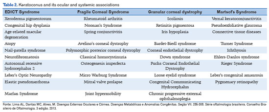 In large population studies, family history varies between 5% and 20%, with a mean of 12%-13%4-11. Keratoconus is considered a heterogeneous genetic condition, with incomplete penetrance and variable expression. Most familial cases are of autosomal dominant inheritance with variable expression. Many genes are involved, including homeobox VSX1, SOD1, TGFB1, MIR 184, COL4A3/COL4A4, and FLG. The association of keratoconus with other ocular and systemic diseases is not uncommon (Table 2)4-10.