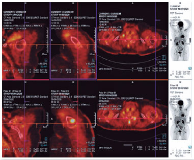 Owing to the progression of metastatic disease, gefitinib 250 mg/day was introduced. After 03 months using gefitinib 250 mg, the patient had improvement in visual symptoms, recovery of visual acuity to 20/20 and marked regression of the left eye lesion, with superior temporal focal alteration of the retinal pigment epithelium, without signs of activity, with OCT of the lesion area showing atrophy of the cystic spaces of the Satler and Haller layers, but maintenance of the integrity of the outer and inner retinal layers and the ellipsoid zone. In a new PET-CT the disease remission was observed, with no metastatic lesions and no signs of active disease (Figures 2 a 5)