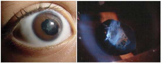 There are other causes of prelenticular leukocoria, including the presence of persistent congenital pupillary membrane, especially in patients with a blue iris, and that of central circular corneal leukoma (Figure 6) affecting the visual axis. 9 Identification of prelenticular leukocoria allows a surgical strategy plan to avoid unnecessary lens removal. Early achievement of a clear visual axis is of great importance for prevention of amblyopia in children with prelenticular leukocoria. Use of anterior chamber ultrasonic biomicroscopy is helpful for an accurate diagnosis of prelenticular leukocorias as well as to better identify patients with a clear or opacified lens.