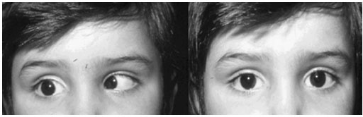 1. Paretic strabismus. This results from the weakness of one or more extraocular muscles. The most common causes are lesions of cranial nerve pairs II, IV, and VI. This type of strabismus is distinguished by the asymmetry of the deviations and limited eye rotation. The asymmetry is observed in cases in which the deviation increases with the fixation of the affected eye and in the field of action of the weakened muscle. The diagnosis is made by examining the eye rotations and by measuring the deviations in the nine diagnostic positions of the eye: forward, right, left, up, down, right up, left up, right down, and left down. Photographs of the child that show abnormal positions of the head will indicate that the problem has existed at least from the time of the oldest photograph.