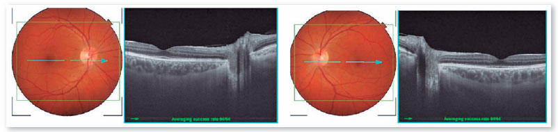 Homem de 37 anos, trabalhador da indústria alimentícia, com queixa de perda visual bilateral indolor há quatro meses. Ele notou escotomas escuros e visão turva em ambos os olhos (AO). A melhor acuidade visual corrigida (BCVA) foi de 20/20 no olho direito (OD) e 20/80 no olho esquerdo (OE). A retinografia de fundo revelou edema bilateral do disco óptico e alterações pigmentares discretas no polo posterior, mais proeminentes no olho esquerdo (Figura 1). O paciente havia sido submetido previamente a ressonância magnética de encéfalo, que não revelou nada. O exame de fundo de olho revelou a presença de áreas de hiperautofluorescência intercaladas com pontos de hipoautofluorescência em toda a região macular e ao redor do disco óptico (Figura 1). O exame de OCT revelou aumento da espessura da camada de fibras nervosas peripapilares, ausência de sinais de deslocamento anteroposterior do disco óptico e do complexo retina peripapilar/membrana de Bruch, sinais de pontos hiperrefletivos sobre o disco óptico, sugestivos de células inflamatórias presentes em o vítreo em AO (Figura 2). O Bscan OCT sobre a mácula revelou a presença de fragmentação e ruptura da zona elipsoide (EZ) e da membrana limitante externa (MLE) AO (Figura 2). Esses achados reforçam a possibilidade de neurorretinite sifilítica. O exame de sangue revelou VDRL 1/64 positivo e FTAABS IgM e IgG. O teste sorológico para HIV foi negativo. O tratamento com Penicilina G cristalina foi realizado por 14 dias. O exame oftalmológico seis semanas após o tratamento mostrou melhora da AV, 20/20 AO. A OCT revelou melhora do edema do disco óptico, regressão da presença de células no vítreo e reconstituição do EZ e ELM (Figura 3). A paciente permaneceu em acompanhamento oftalmológico e neurológico sem intercorrências ou sinais de piora.