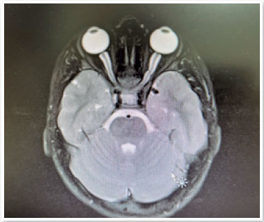 Based on these findings, an MRI examination was requested, which revealed a thickening of both optic nerves in the chiasm region (Figure 2). Thus, an optic nerve glioma hypothesis was confirmed and the child was referred for chemotherapy treatment.