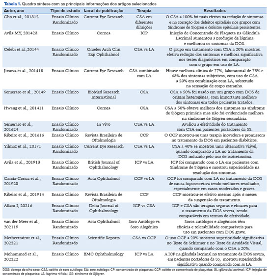 MÉTODO: O estudo foi definido como uma revisão integrativa, sendo feito buscas nas fontes de dados MEDLINE, LILACS, SciELO e EMBASE, utilizando os descritores: "síndrome do olho seco", "doença do olho seco", "tratamento do olho seco", "sangue", "soro" e "plasma rico em plaquetas". Foram identificados 597 publicações potencialmente elegíveis, selecionando-se, ao final, 16 ensaios clínicos randomizados e não randomizados que atendiam aos critérios de inclusão.