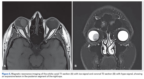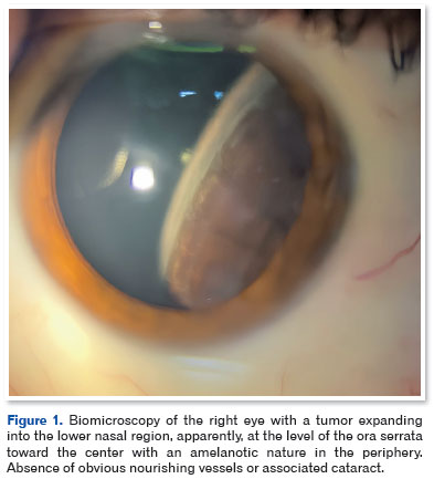 Differential diagnosis is challenging, including other ciliary body masses, such as melanoma, nevus, adenoma, and epithelial adenocarcinoma1. In the case reported herein, US and MRI of the eye were fundamental in characterizing the extent and location of the lesion. The imaging characteristics, such as the absence of angle kappa on US and iso-signal on T1-weighted MRI, were not typical of melanoma. However, due to the rapid growth, severe visual impairment, and lack of effective therapeutic alternatives, enucleation was the chosen treatment.
