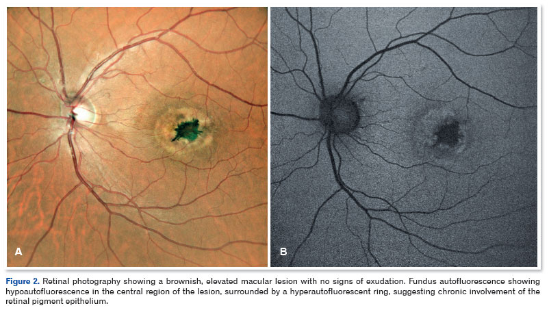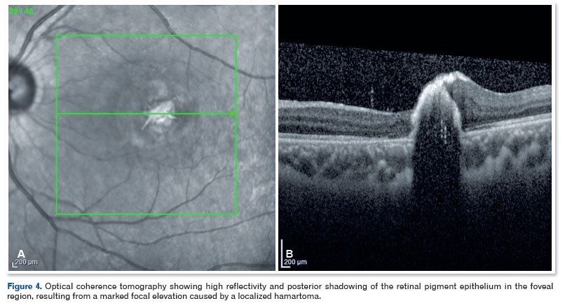However, simple RPE hamartoma is a rare congenital malformation consisting of normal RPE cells organized in an anomalous way, without atypia or mitotic activity7,8. Clinically, the lesion presents as a focal, flat, or slightly raised pigmented area located at the posterior pole. It is usually asymptomatic and is detected incidentally during eye examinations. In the case reported herein, the lesion was diagnosed via multimodal exams, such as OCT and OCT-A, which showed focal elevation of RPE and anomalous superficial vascularization.