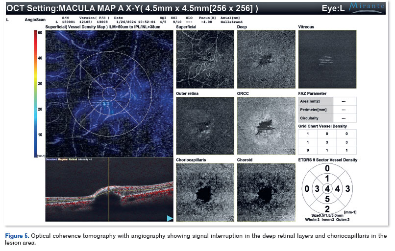 In view of these findings, the initial hypothesis was ciliary body melanoma in right eye and an unrelated congenital lesion in left eye, prompting further tests. Ultrasound (US) of right eye showed a hypoechoic cupuliform mass measuring 15.3 × 18.7 mm that was homogeneous and had medium internal reflectivity and no angle kappa (Figure 3). In left eye, US showed a hyperechogenic flat lesion measuring 1.1 × 1.3 mm. Optical coherence tomography (OCT) of left eye showed focal elevation of RPE with posterior shadowing (Figure 4), whereas OCT angiography (OCT-A) showed anomalous superficial vascularization, without deep vessels or signs of ischemia, compatible with simple RPE hamartoma (Figure 5).