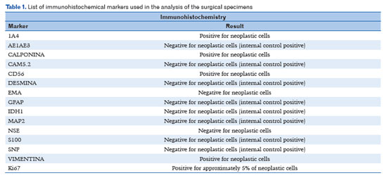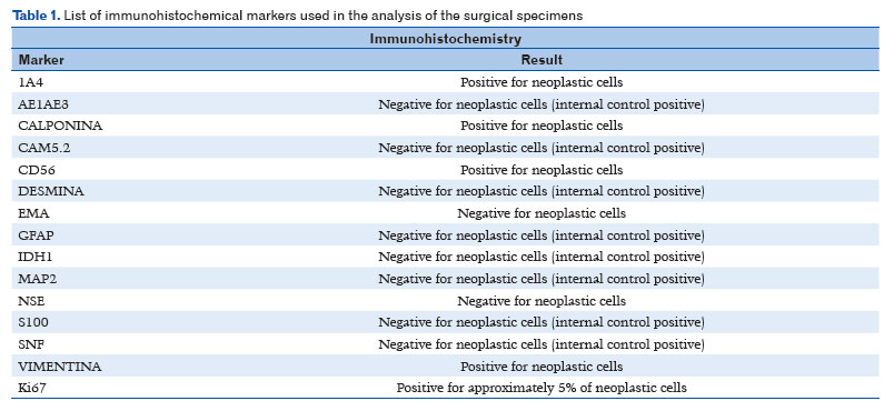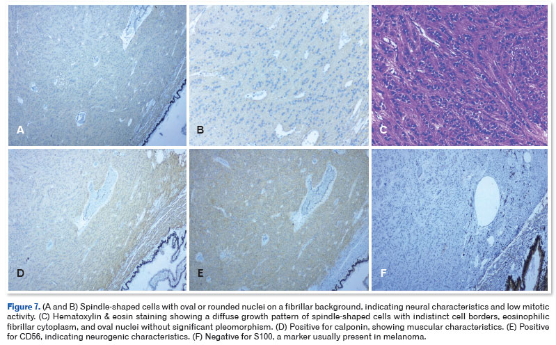 Pathology showed a mesectodermal leiomyoma of the ciliary body, measuring 1.8 × 1.7 × 1.4 cm, with free margins and retinal detachment secondary to the neoplasm. Immunohistochemical profile confirmed the mesectodermal origin, with positivity for 1A4, calponin, CD56, and vimentin, and negativity for S100, which allowed ruling out the initial suspicion of uveal melanoma (Figure 7 and Table 1). After a year’s follow-up, the lesion in left eye remained stable, with no signs of progression.